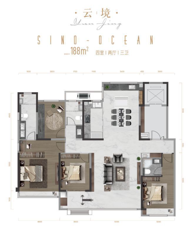 约188㎡,为稀缺的1T1户大平层产品,采用南向四面宽+宽厅的配置。它有几个核心亮点: