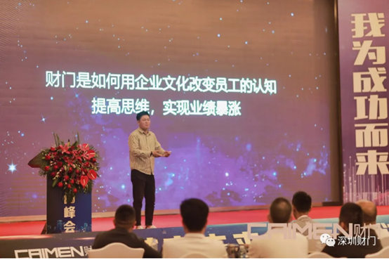 董事长黄少安则和大家分享了如何困扰行业的同质化的营销痛点,从多个维度向大家揭秘财门集团连续数年业绩翻倍的秘密。深入浅出剖析了财门是如何用企业文化改变员工认知,提高思维,实现业界暴涨。