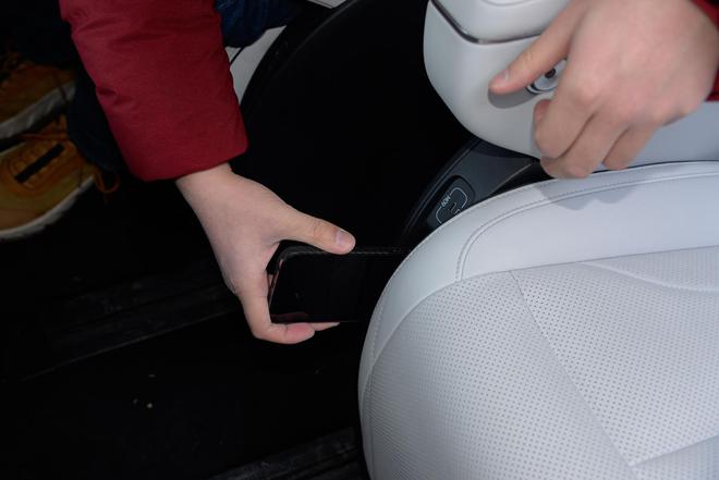 后排提供60W充电满足办公需求,但侧面放手机卡槽的内部软垫太紧了,拔插都不够自如方便。例如我这台大屏手机装有金属保护框,放入和取出能够感受到明显阻力偏大。